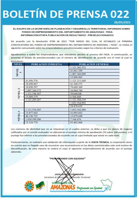 La secretaría de Planeación y Desarrollo Territorial informa sobre el Fondo de Emprendimiento del Departamento de Amazonas - FEDA. información etapa publicación de resultados - preseleccionados.