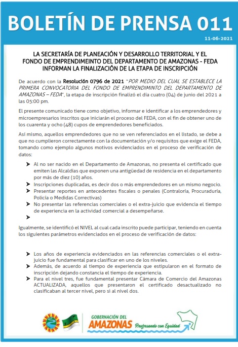 La secretaría de Planeación y Desarrollo Territorial y el Fondo de Emprendimiento del Departamento de Amazonas - FEDA informan la finalizacion de la etapa de inscripción.
