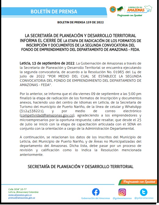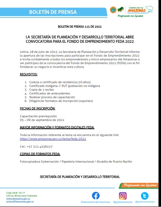 La secretaría de Planeación y Desarrollo Territorial informa sobre el Fondo de Emprendimiento del Departamento de Amazonas - FEDA. Informacion cierre de etapa de inscripción y documentos de la segunda convocatoria del FEDA 2022