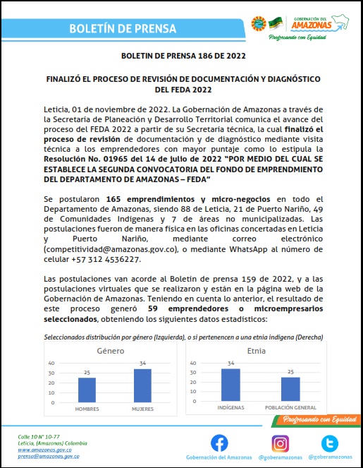 La secretaría de Planeación y Desarrollo Territorial informa sobre el Fondo de Emprendimiento del Departamento de Amazonas - FEDA. Finalizó el proceso de revisión de documentación y diagnóstico del FEDA 2022