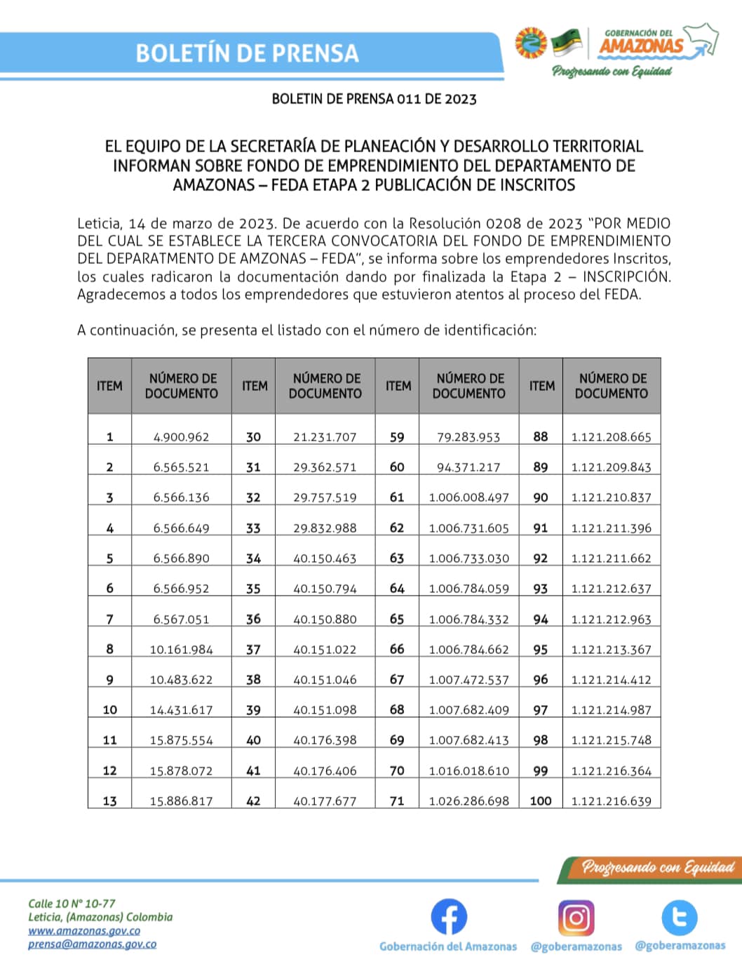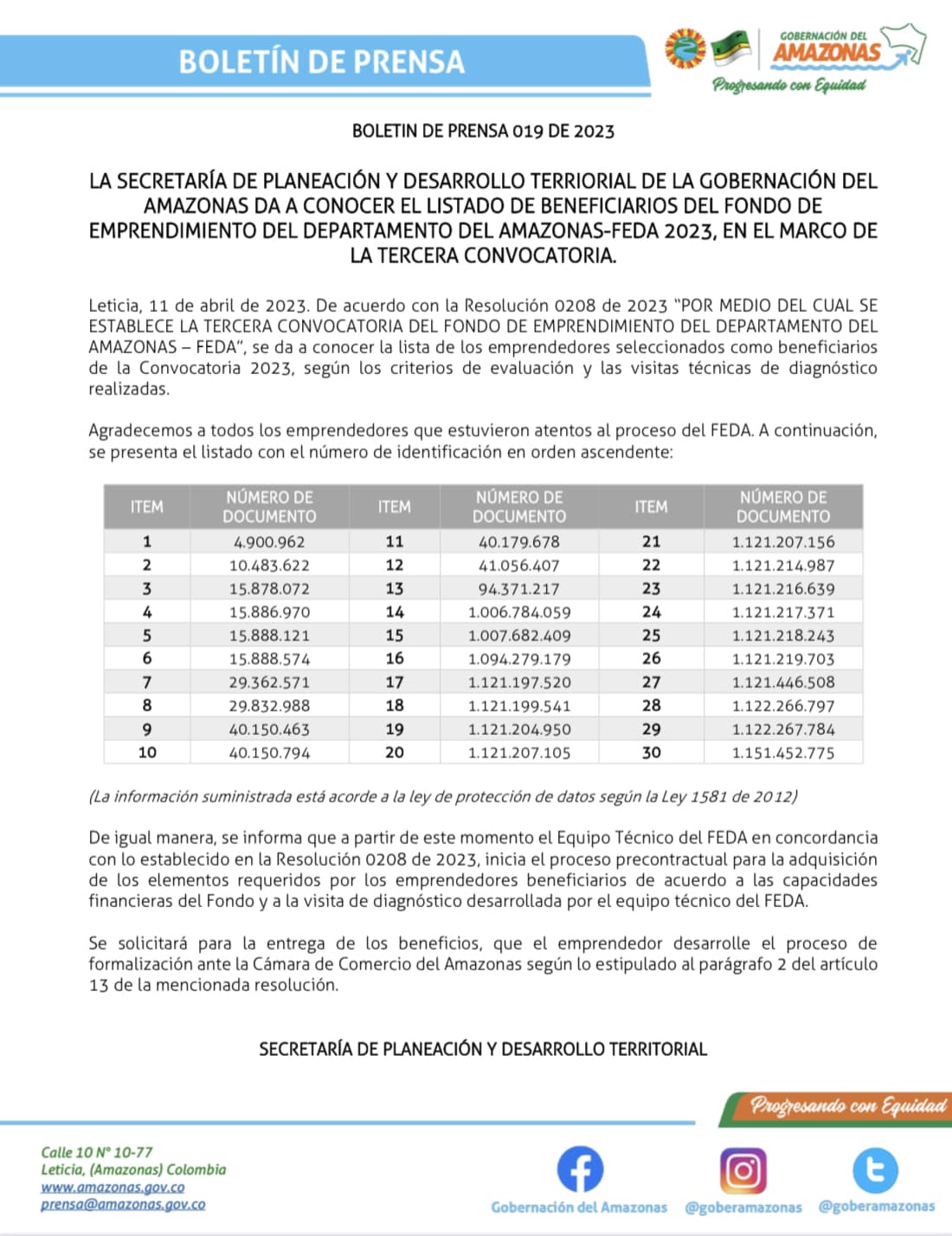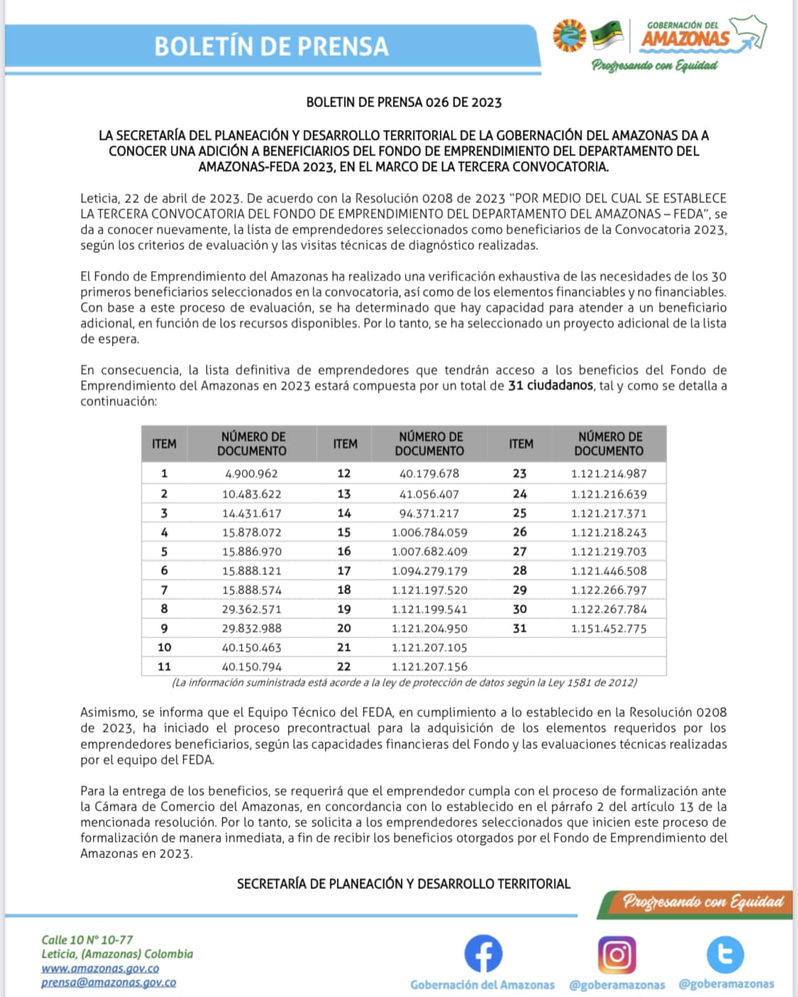 La secretaría de Planeación y Desarrollo Territorial informa sobre el Fondo de Emprendimiento del Departamento de Amazonas - FEDA. información etapa publicación de resultados 2023.